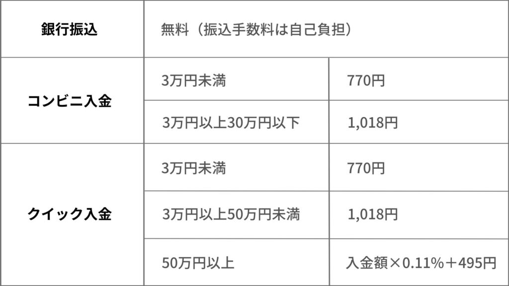 ですが、コンビニ入金・クイック入金の場合は入金する金額に応じて入金1回あたり手数料が発生します。