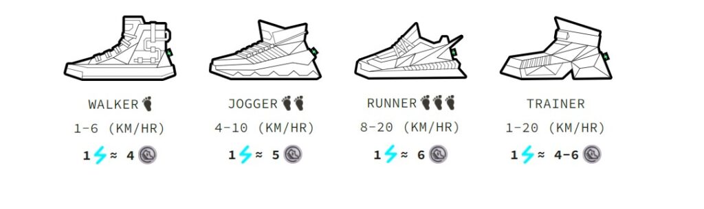 スニーカーの種類にはWolker、Jogger、Runner、Trainerの4種類があり、それぞれ時速やGSTを稼げる量も変わり、自分に合う速度のスニーカーを選びます。
